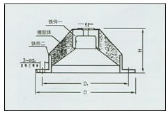 JGD型橡膠剪切隔震器是由內、外鋼套和中間的合成橡膠組成,經硫化呈中空圓錐體,橡膠部分受剪切力,具有較大的變形范圍和較低的固有頻率。工作溫度范圍在-15℃~+60℃,溫度變化時,剛度也有所變化;阻尼比C/Cc≥0.07。